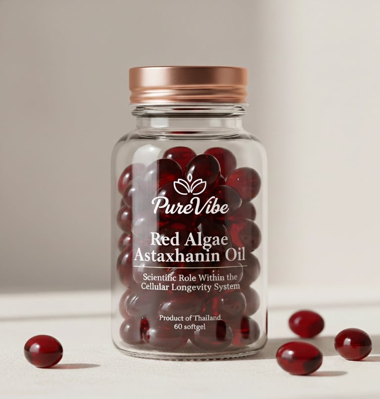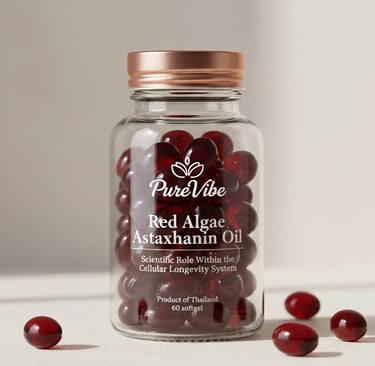 PureVibe Red Algae Astaxanthin Oil is a high-purity lipid-soluble antioxidant formulation engineered to support cellular protection and structural resilience. Developed for international longevity distribution channels and premium wellness markets, PureVibe delivers advanced antioxidant defence designed to help maintain cellular integrity under oxidative stress conditions associated with biological ageing.